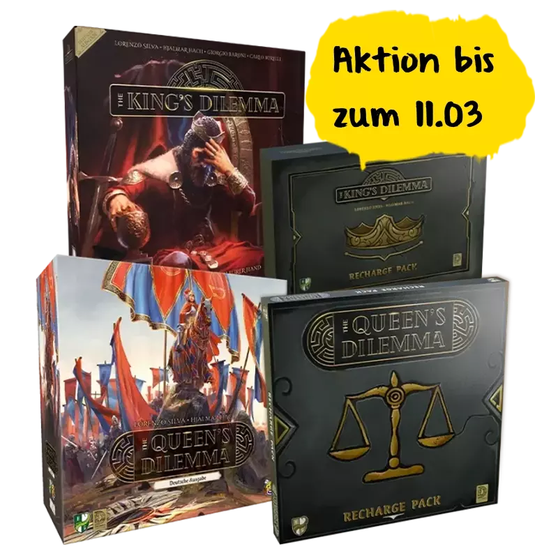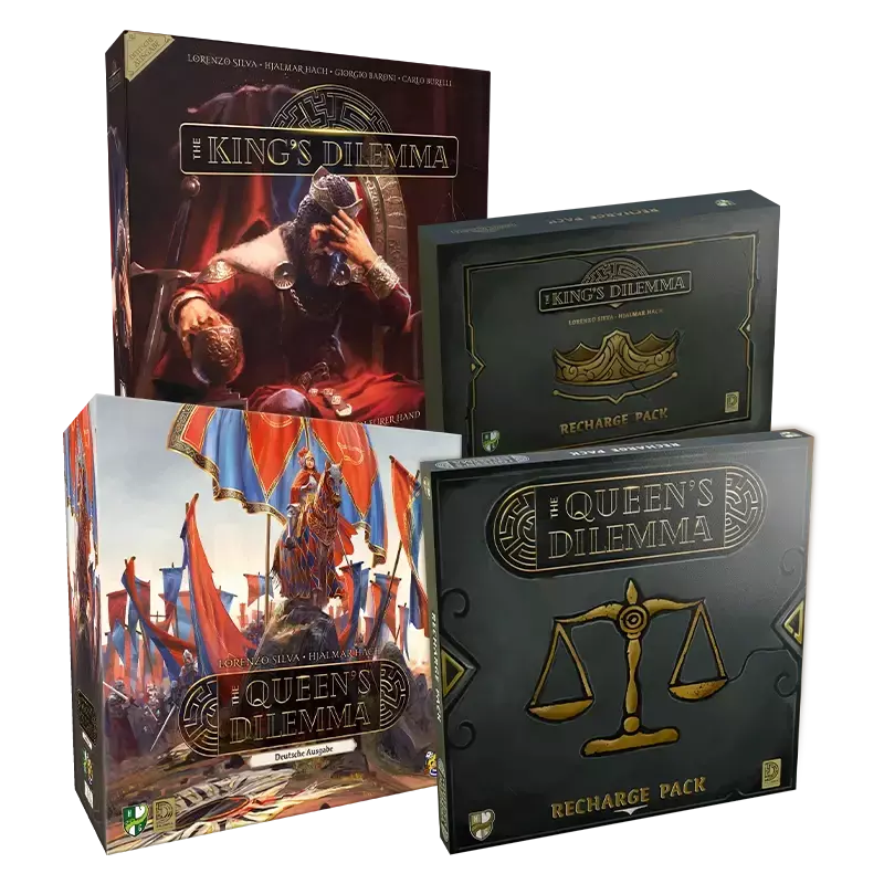 Mit dem enthaltenen Age of Disorder Pack enthält das Spiel eine Erweiterung, die den Übergang von The King’s Dilemma zu The Queen’s Dilemma spielerisch erzählt und euch erste wichtige Entscheidungen abverlangt.The King’s Dilemma ist die interaktive Legacy-Geschichte des Königreichs Ankist. Den Kern des Spiels bildet ein sich entwickelnder Stapel von Ereigniskarten. Jedes Ereignis tritt genau einmal ein, ihr müsst euch also ständig neuen Herausforderungen stellen. Eure Entscheidungen bestimmen, welchem der verzweigten Handlungsstränge ihr zu einem der vielen möglichen Enden folgt. In jeder Runde zieht ihr eine Karte vom Dilemma-Stapel und erfahrt von den neuesten Ereignissen im Lande. Jedes Ereignis stellt euch vor eine Wahl, die ihr gemeinsam im Namen des Königs treffen müsst.Ihr werdet diskutieren, verhandeln und schließlich eine Entscheidung treffen, die zu neuen Ereignissen führt und so den Fortlauf der Geschichte bestimmt. Doch jeder von euch vertritt auch die Interessen seines eigenen Hauses: Ein Machtkampf, der das Königreich zu Reichtum und Wohlergehen führen kann, aber auch zu Kriegen, Hungersnöten und Aufständen. Jede eurer Entscheidungen hat Konsequenzen und was gut für das Königreich als Ganzes ist, kann schlecht für deine Familie sein. Handelst du für das größere Wohl oder nur zu deinem eigenen Besten?The Queen's Dilemma spielt hundert Jahre nach den dramatischen Ereignissen des ersten Spiels und baut auf dem revolutionären Dilemma-Kartensystem auf. Es bietet eine brandneue Geschichte und, verbessert die bestehenden Legacy-Mechanismen und fügt viele neue exklusive Funktionen hinzu. Mit dem enthaltenen Age of Disorder Pack enthält das Spiel eine Erweiterung, die den Übergang von The King’s Dilemma zu The Queen’s Dilemma spielerisch erzählt und euch erste wichtige Entscheidungen abverlangt. Nehmt euren Platz im Rat der Königin ein und wählt aus sechs einzigartigen Charakteren eure eigene Rolle aus. Entwickelt euren Charakter mit exklusiven persönlichen Fähigkeiten. Jeder Charakter verfügt über Herzogtümer oder Grafschaften unter seiner direkten Kontrolle sowie über eine Reihe geheimer persönlicher Ziele und verzweigter Erzählstränge, die seine Geschichte und seine zukünftigen Ziele bestimmen – die sich möglicherweise mit dem Schicksal des gesamten Königreichs verflechten.