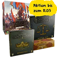 The Queen’s Dilemma werdet ihr mit einer Reihe einzigartiger Dilemma-Karten konfrontiert, die jeweils eine wichtige Entscheidung für den Rat enthalten. Es gibt immer zwei Möglichkeiten, die Frage der Dilemma-Karte zu beantworten und zu lösen. In spannungsgeladenen Abstimmungen entscheiden die Spieler, welchen Weg sie einschlagen wollen, indem sie ihre Macht einsetzen, um ihr gewünschtes Ergebnis durchzusetzen, Ressourcen austauschen, um andere Spieler zu bestechen und auf ihre Seite zu ziehen, und Vereinbarungen treffen, um ihre Agenda voranzutreiben.